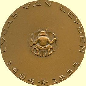 Penningkunst. Vz. zelfportret van Van Leyden. Kz. de schilder