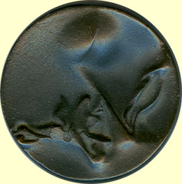de boeienkoning van voren gezien. Kz. de achterzijde van de boeienkoning. Brons gegoten, onrond, ca. 70 mm. HS pag. 519-521. Prachtig. 400,00 |